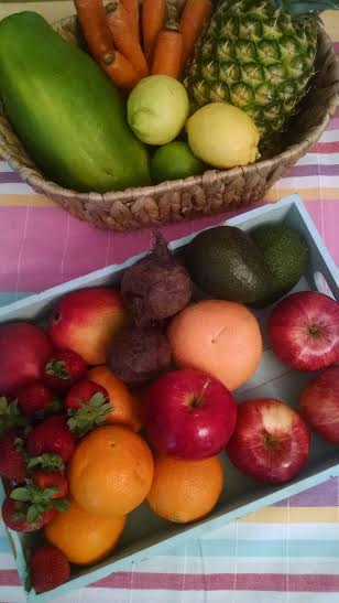 Esta es mi lista fija de la semana: papaya, mango, piña, fresas, manzanas, naranjas, pomelo, zanahorias, plátanos, remolacha, aguacate, pepino y limón. A veces también incluyo uvas, picotas, melón o sandía.