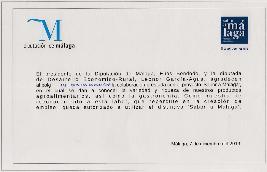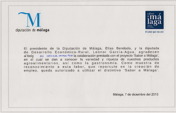 Agradezco a Sabor a Málaga, éste reconocimiento, ésta distinción a Mi cocina, a mi blog, donde mis recuerdos, mi memoria, mi historia, las tradiciones, los platos de mi familia se convierten en un recetario de 367 (Trescientas sesenta y siete) entradas de RECETAS TIPICAS MALAGUEÑAS al dia de hoy, platos genuinos de nuestra querida Málaga.