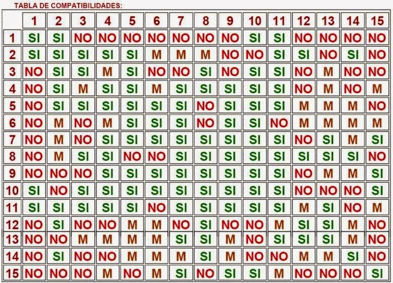 Después de la lista, viene la tabla. Un cuadro de 15 x 15 para mezclar los grupos de alimentos. En cada cruce de grupos te pondrá un SI si se pueden mezclar sin problemas y adelgazarás, un NO para que no los mezcles, y una M que significa que los puedes mezclar si quieres mantener peso, pero no si lo que quieres es adelgazar.