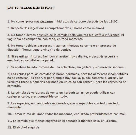 Aparte de esto, tenemos los 12 mandamientos. Son 12 reglas que hay que seguir; algunas son bastante obvias, pero nunca viene mal recordarlas. Como digo, yo no lo sigo 100%; por ejemplo, yo como carne a la plancha por la noche, que no cumpliría con la regla 1.
