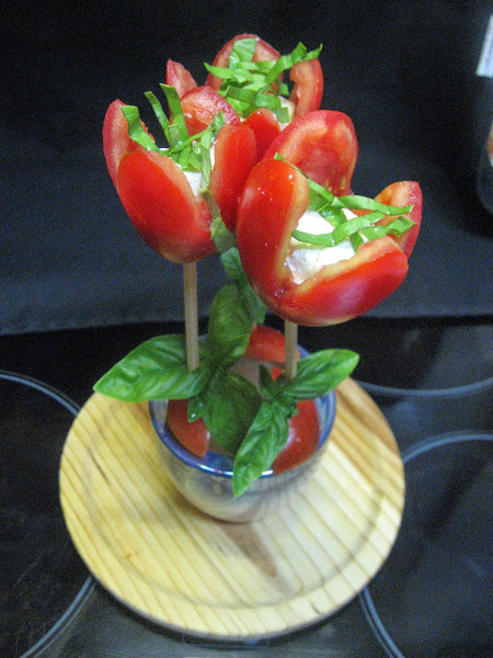 3º " Con un palillo que aguantaremos en la maceta, le colocamos unas hojas de albahaca, clavamos el tomate y seguidamente el queso, cortamos unas hojas de albahaca en juliana y lo colocamos encima. Solo nos queda ponerle un poco de aceite y si queremos hasta un poco de pimienta y listos, fácil y aparente,no os parece?