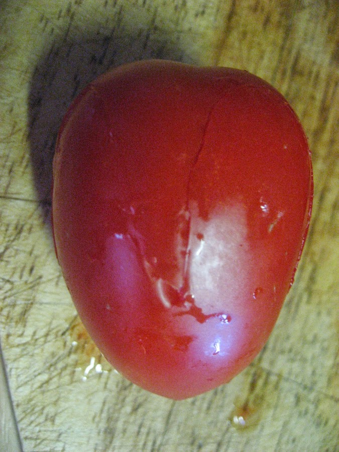1º " Cortamos los tomates con la ayuda de una puntilla, como si les hiciéramos cuatro pétalos.