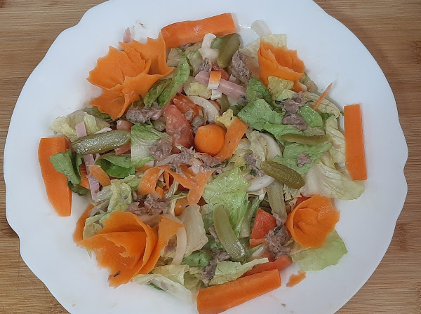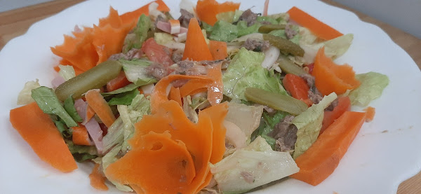 Los ingredientes de la ensalada son los que pille en la nevera. Sólo os cuento los que utilicé porque las cantidades las puse a ojo, dependiendo de los que íbamos a comer. En este caso éramos dos y era nuestro plato principal y único.