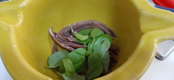 1.- En un mortero ponemos las sardinas escurridas, junto con las hojas de albahaca y machacamos bien, hasta que veáis que se hace una pasta.