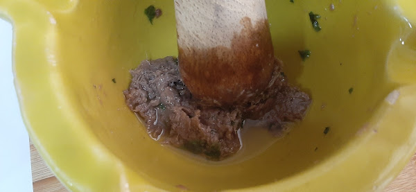 3.- Seguís machando bien hasta que esté todo bien unido y veáis que es una pasta homogénea. Reservamos.