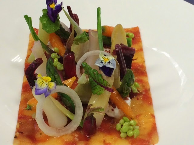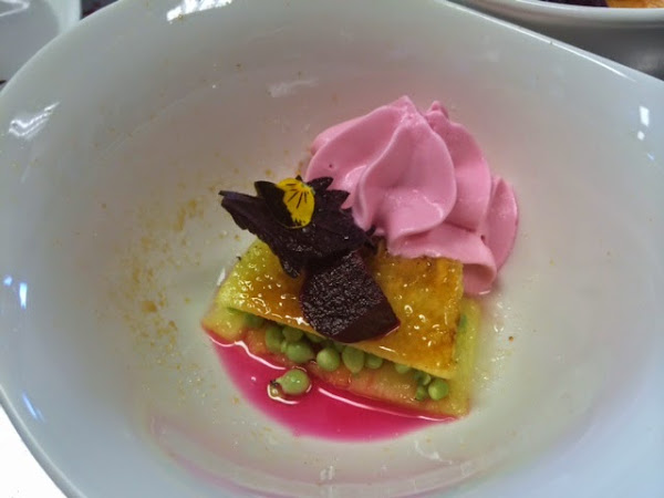 - Piña confitada con guisante lágrima, vainilla y yogurt de remolacha.
