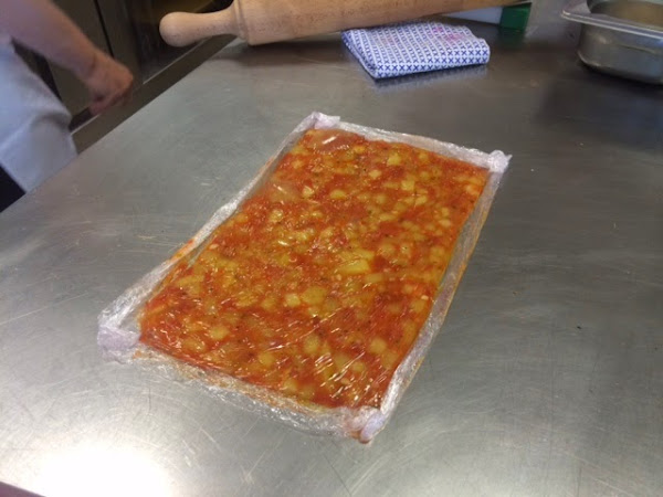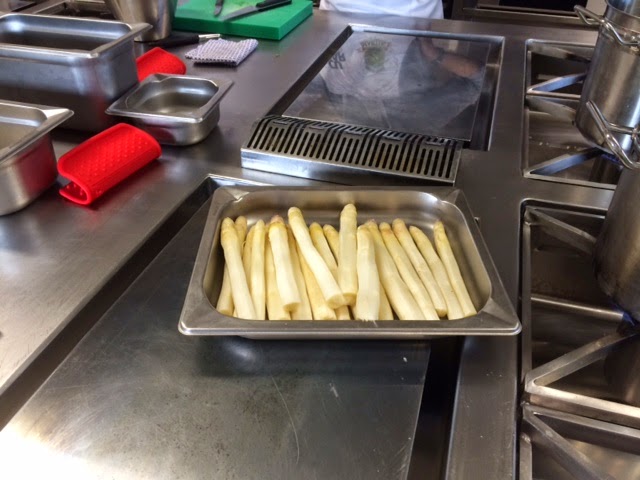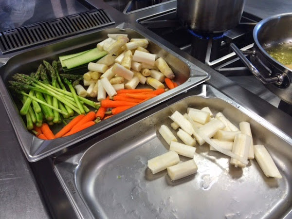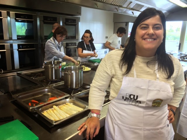 Tras una breve entrada, Aizpea empezó a repartirnos el trabajo, pelar espárragos, pelar tomates, trocear verduras, preparar el caramelo de sidra, preparar los ingredientes para el postre o hacer el jarabe de vainilla.... Todo en un exquisito estrés cocinero y en un ambiente muy distendido.