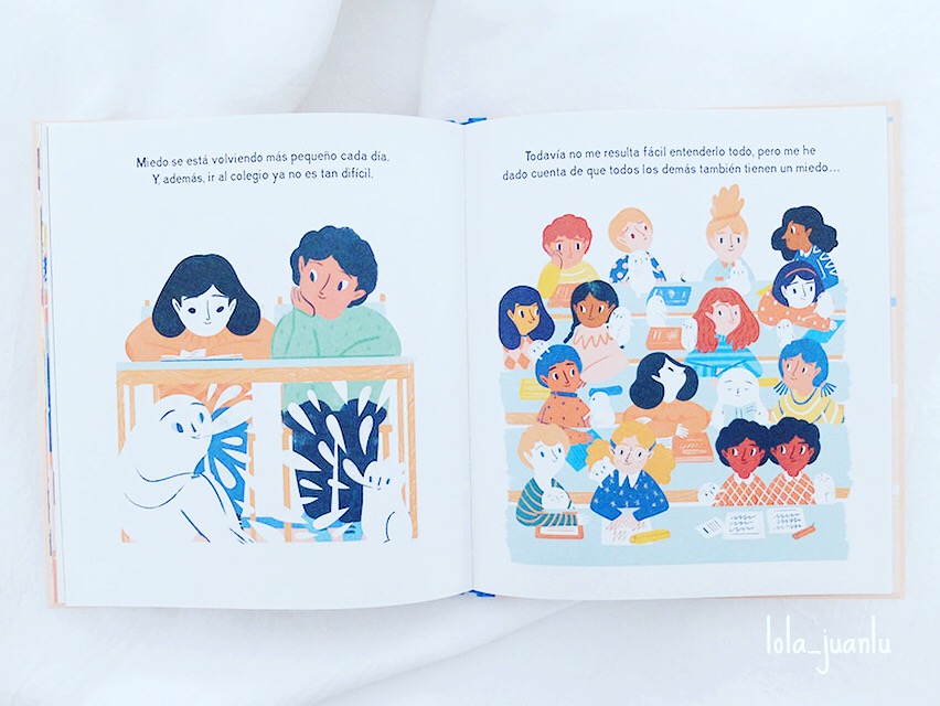 Me gusta cuando la protagonista de este cuento se da cuenta de que no es ella sola la que siempre va acompañada de su miedo, todos sus compañeros están en la misma situación y eso le ayuda a integrarse.