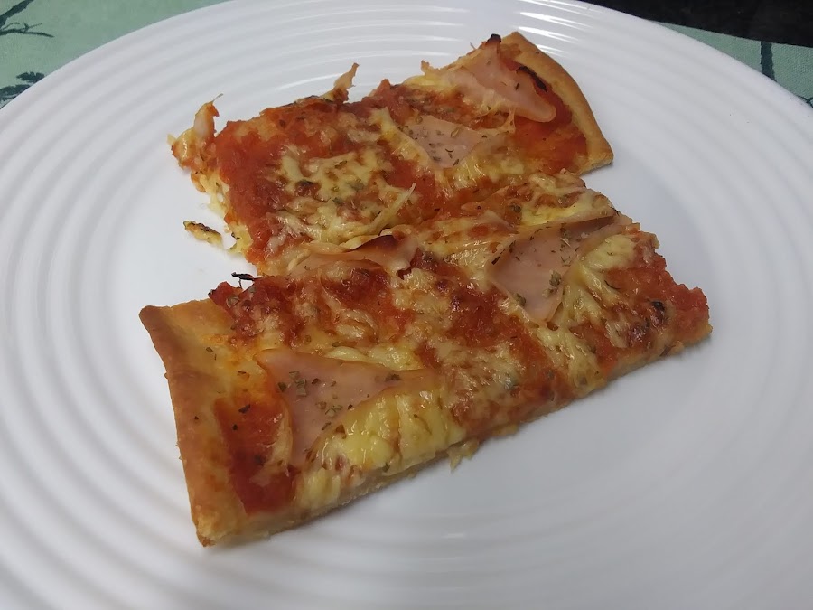 Con estas medidas salen dos pizzas como en la foto. La que sobra se puede congelar en forma de bola dentro de una bolsita y descongelarla en la nevera de un día para otro cuando la volvamos a necesitar. Se vuelve a amasar unos instantes y extendemos.