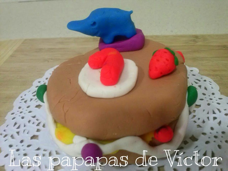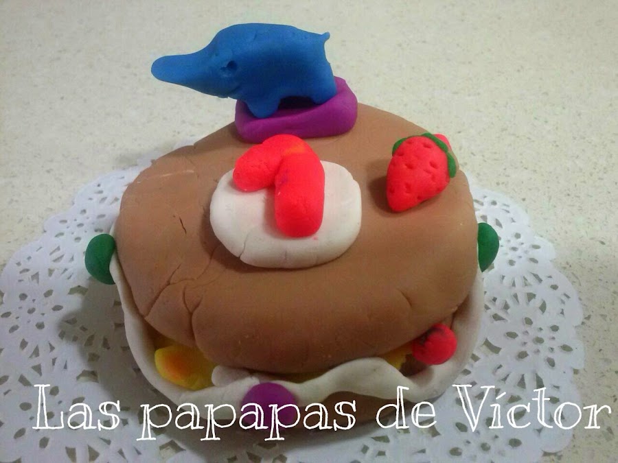 Después lo tapó y aunque no tengo más fotos porque no salieron ninguna bien porque no se estaba quieto, le añadimos alrededor pastilina blanca que hacía de nata (crema de leche) y unas bolitas de colores que era como si fueran perlitas