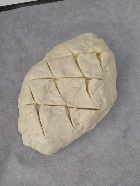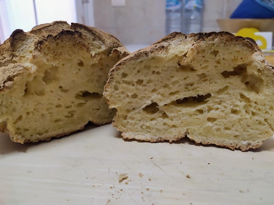 Yo he intentado darle forma de pan de pueblo, le he hecho con un cuchillo unos cortes, antes de meterlo en el horno nos mojamos las manos y sacudimos unas gotas sobre el pan.