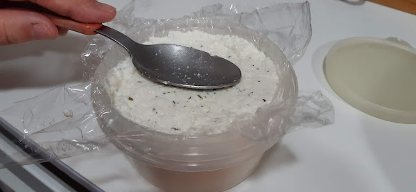 7.- Una vez que tengamos el queso bien escurrido le añadiremos la sal (yo le puse un poco de hierbas provenzales también) y lo mezclaremos bien. Después lo pasaremos a un molde o tuper, o bol, que tenga tapadera y la forma más aproximada a la que se le suele dar al queso.