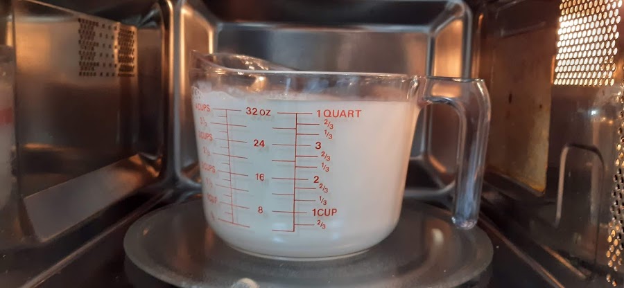 1.- Ponemos en un recipiente de cristal la leche y la calentamos 15 minutos en el microondas, a la máxima potencia. Tiene que calentarse y no hervir. La temperatura que tiene que coger la leche es de unos 90º.