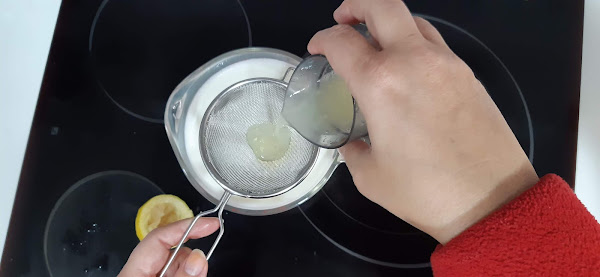 2.- Una vez que se ha calentado la leche, la sacamos del microondas y le exprimimos el zumo de limón, porque ese ácido es lo que equivale al cuajo que ponen en las queserías. Inmediatamente veréis como la leche se corta y queda el suero abajo y arriba una especie de grumos muy consistentes.