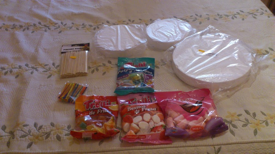 Una vez pegadas ir colocando las chuches y pegandolas con pinchitos de colores (empezando por las esponjitas de los cantos).