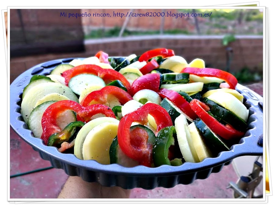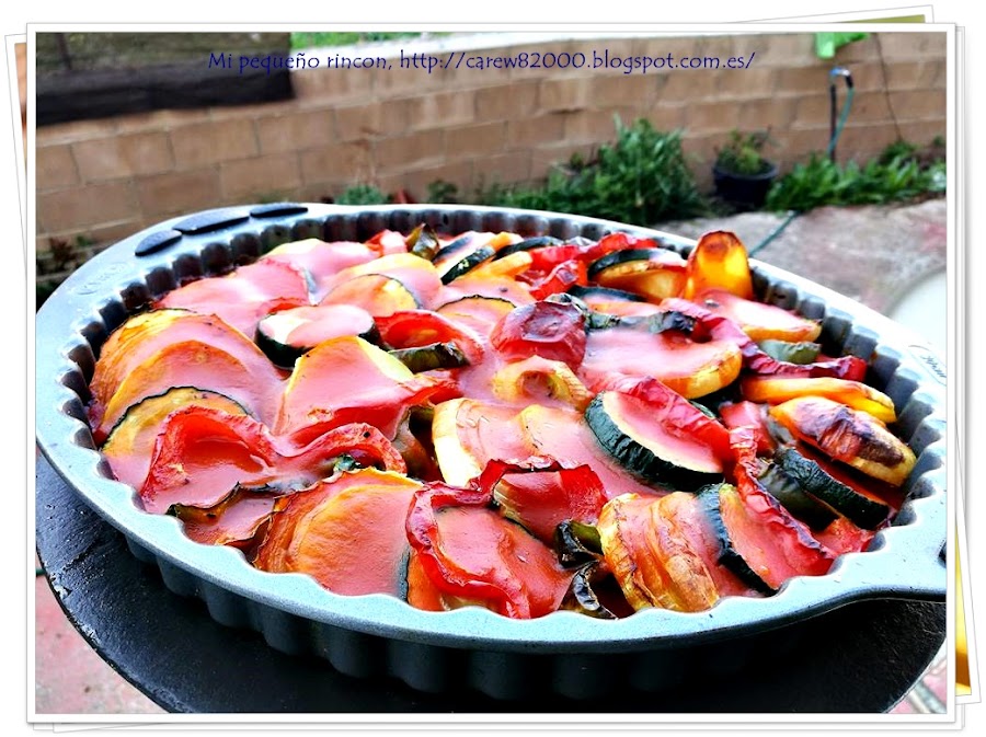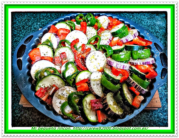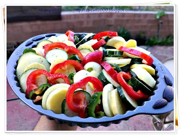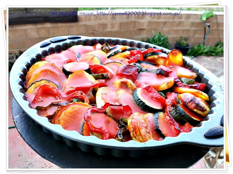 Cogemos un molde bajo de horno o una bandeja y ponemos en la base nuestra salsa de tomate y por encima vamos colocando nuestras rodajitas de verdura formando una espiral , intercalando su colocación , por ejemplo calabacín , pimiento rojo, berenjena , pimiento verde , más o menos como se ve en las fotos .