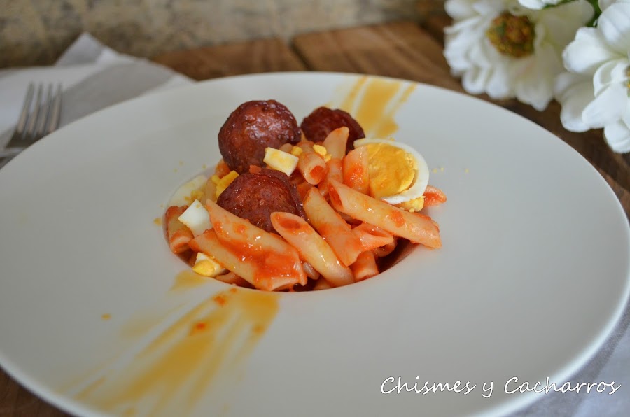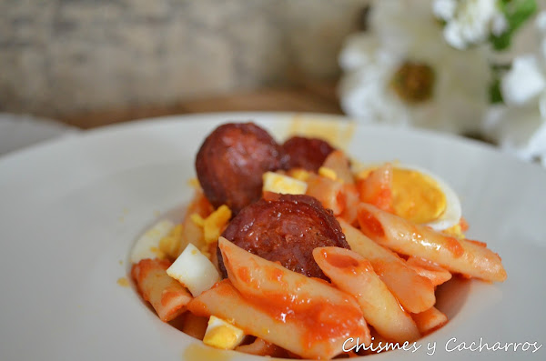 Cocer los macarrones en abundante agua con sal durante el tiempo que indica el paquete 10- 12 minutos, tienen que quedar al dentes. Escurrir los macarrones y pasarlos por agua fría. Poner en la cazuela, verter la salsa de tomate por encima y los huevos cocidos cortados en 4-6 trozos.