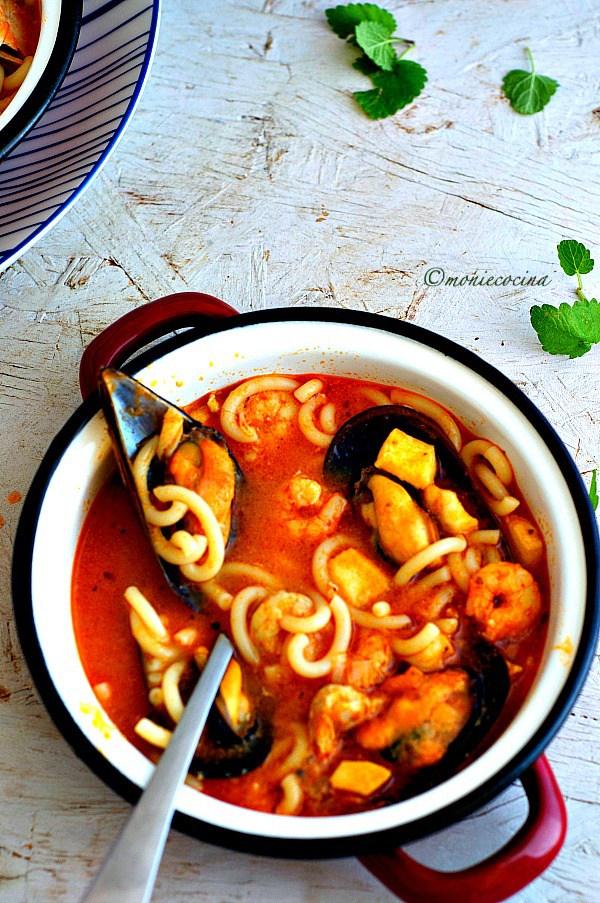 Dejamos cocer unos 10 minutos tapado a fuego medio, luego añadimos los mejillones y los fideos y cocemos otros 10 minutos hasta que estén listos. Y ya está. Riquísima y muy fácil.