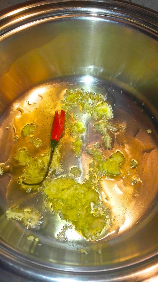 En primer lugar, vamos a poner al fuego el jengibre, ajo y guindilla con un poquito de aceite