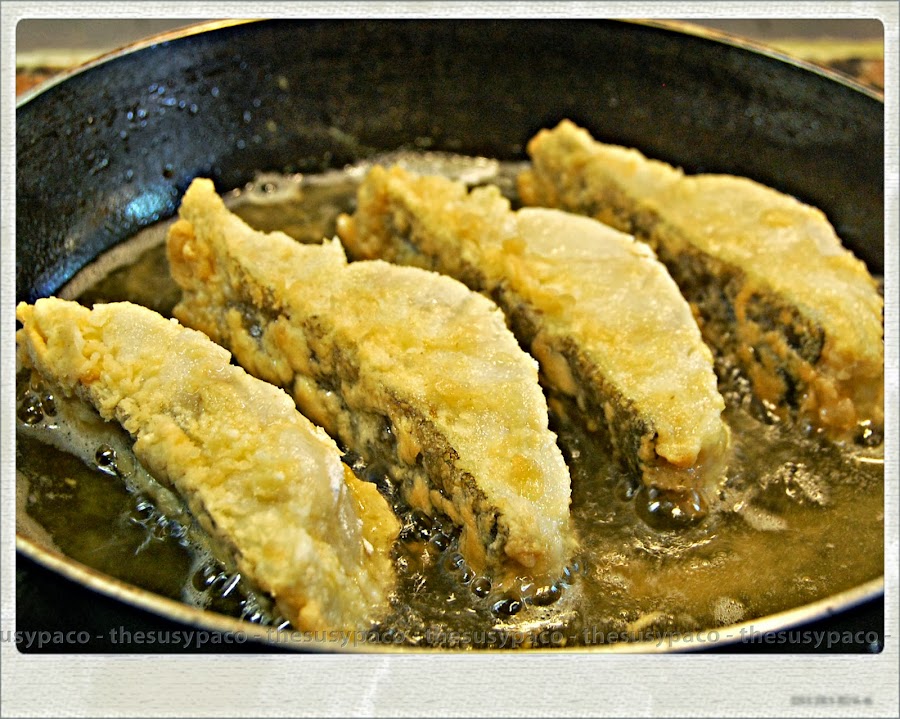 ~ Con el aceite caliente introduce los trozos de bacalao y modera el fuego para que se dore pero no se queme y quede muy jugoso.