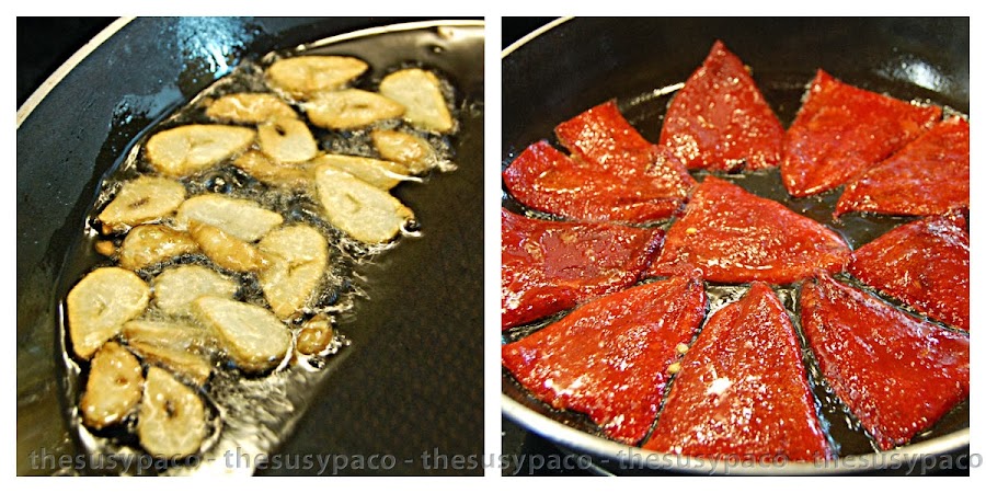 ~ En otra sartén pon un poco de aceite y dora los ajos fileteados. Retira y seca en papel