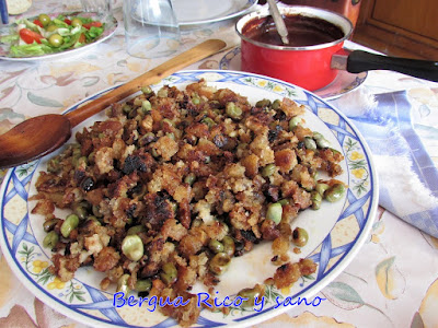 Las migas "de pastor" son una receta tradicional española muy rica e interesante; las hay de pan y de harina, pero además, en cada pueblo varía algún ingrediente; por ejemplo, en Aýna las he comido con uvas, en algunos pueblos llevan chorizo y, en otras partes, se acompañan de huevo frito, torreznos, sardinas, pimientos, etc. En casa de mi abuela se hacen de pan; con habas, tocino, ajo y chocolate espeso. Sí, sí, chocolate, que todo el mundo pone cara rara hasta que lo prueba y acaba relamiendo el plato =P Es una variante de las migas andaluzas. Y, al contrario que en otras zonas, no les añadimos pimentón.
