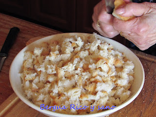 1. Desmenuzamos el pan (con corteza) con la mano, nos podemos ayudar con un cuchillo. Nos mojamos las manos con agua y humedecemos ligeramente el pan.