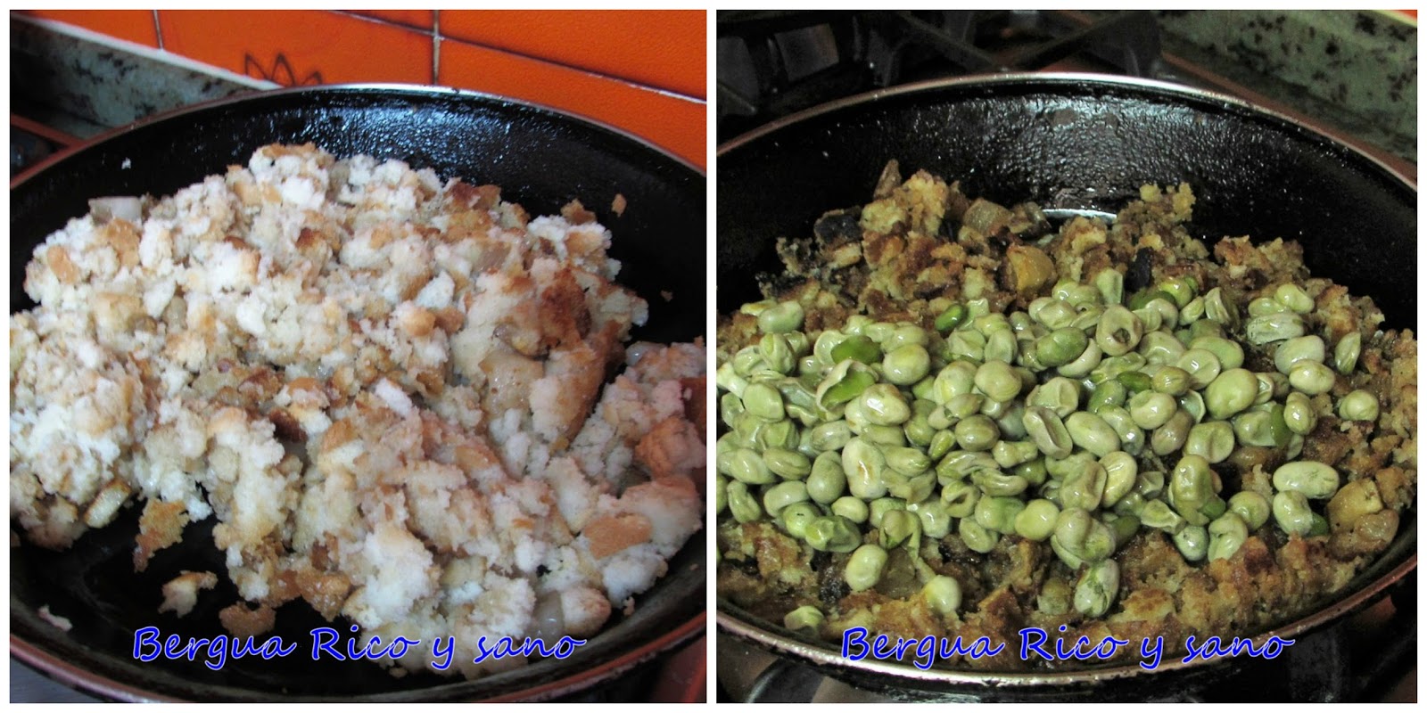 6. Cuando el tocino tenga ya buen color, añadimos el ajo, las habas, las migas de pan, sal y pimienta. Removemos y mezclamos, siempre con cuchara de madera. Las migas se dejan al fuego (bajo-medio) hasta que estén tostadicas; las movemos de vez en cuando.