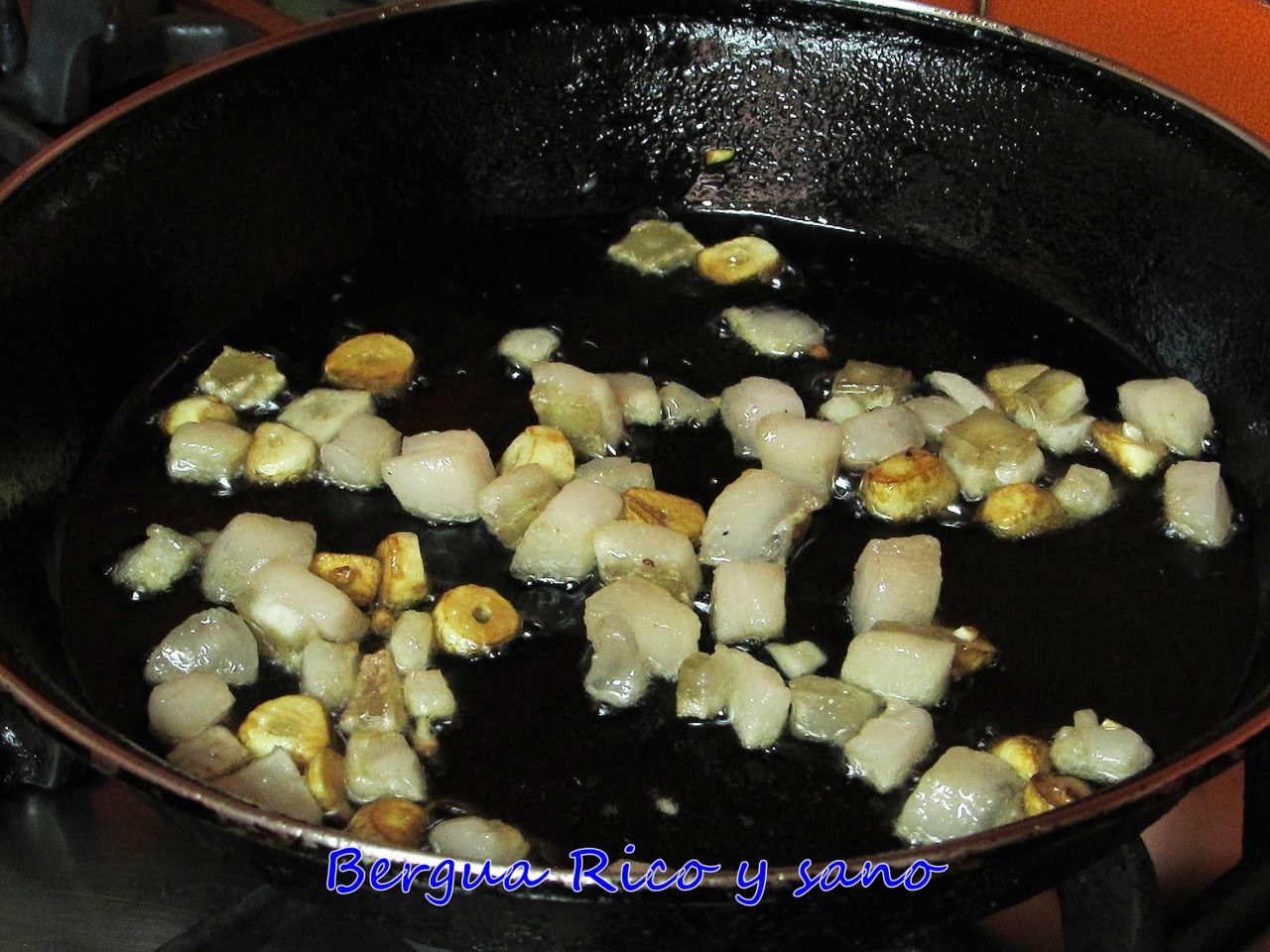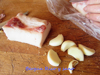 2. Cortamos el tocino en taquitos. Si lleva una corteza muy dura, se la podemos quitar; al gusto.