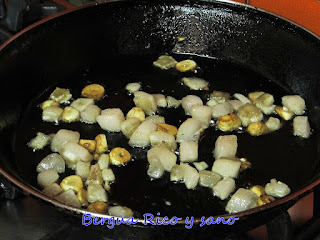 5. En la misma sartén, freímos el tocino en taquitos. Le damos bastantes vueltas para que se cocine de forma uniforme.