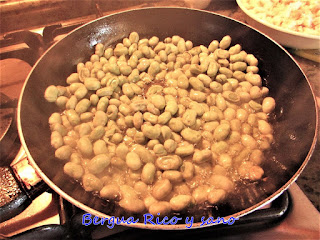 3. Calentamos 1-2 cucharadas de aceite en una sartén y freímos las habas (si son congeladas, se pueden freír directamente sin descongelar). Cuando estén, se sacan de la sartén y se reservan.