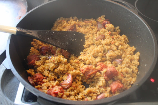 Cuando las migas están casi hechas, añadimos el chorizo.