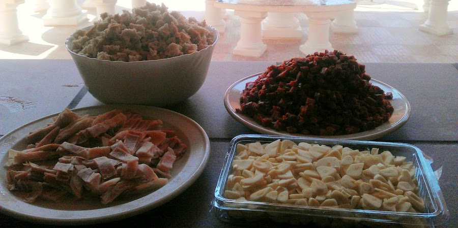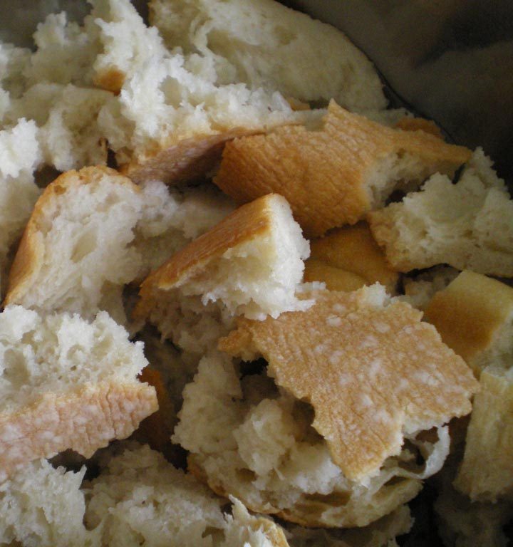 Lo primero es trocear todos los ingredientes, el pan, con las manos, es entretenido, por eso es mejor hacerlo en una reunión y que todos colaboren, deben ser trozos pequeños, yo los pongo con corteza y todo, y una vez que está troceado lo rociamos con medio vaso de agua, removiéndolo.