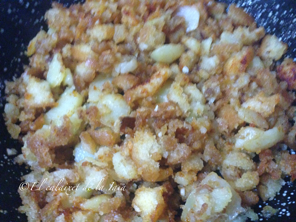 y ahora es cuestión de ir dando vueltas y vueltas con el fin de que no se quemen, hasta que quede el pan crujiente y dorado jutno a las patatas