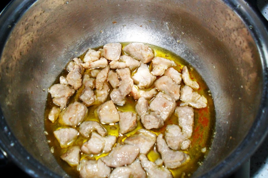 En otra sartén freímos los pimientos y la panceta o lomo y reservamos.