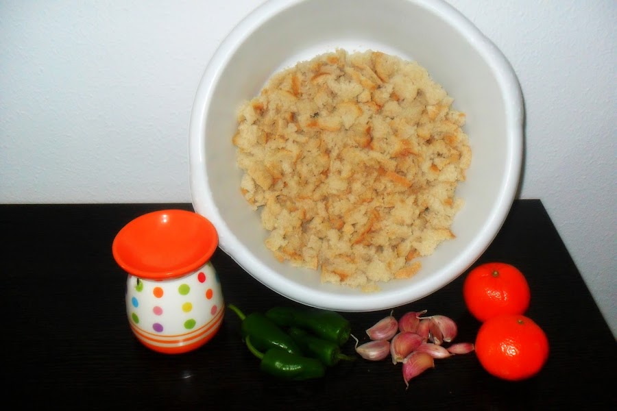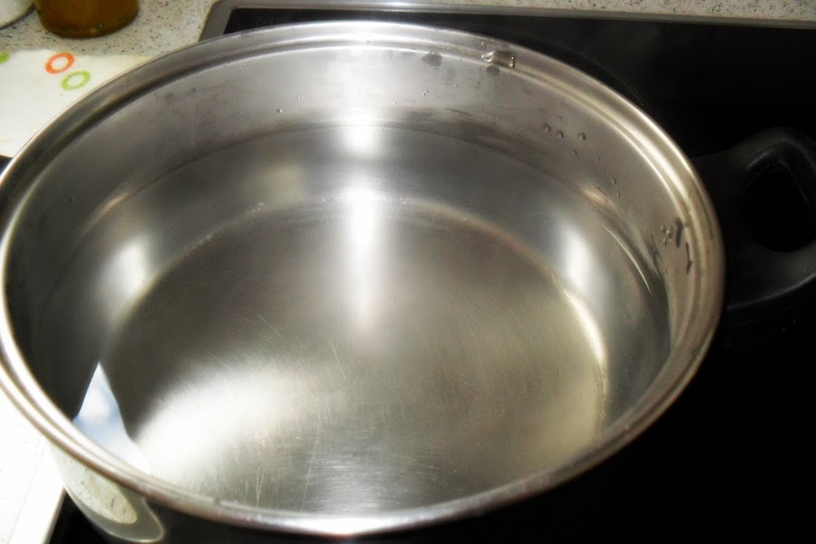 Picamos el pan, ponemos agua al fuego, añadimos sal al gusto (el truco es probar el agua hasta encontrar el punto).