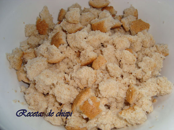 La noche anterior cortar el pan con las manos en trozos pequeños y rociarlo con unas 6 cucharadas de agua, remover el pan y dejar tapado con un paño limpio para que se vaya esponjando.