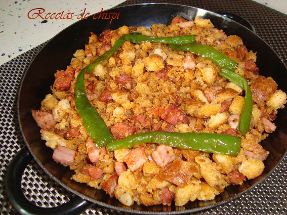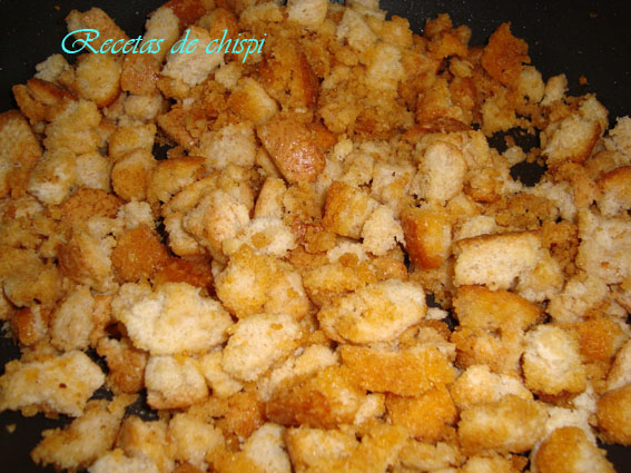 Retirar y reservar, echamos el pan en esa misma sartén y con una cuchara de palo vamos removiendo constantemente hasta que todo el pan esté frito.