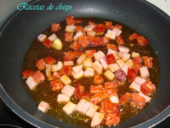 En ese mismo aceite echar el chorizo y el bacón en daditos y freir tambien.