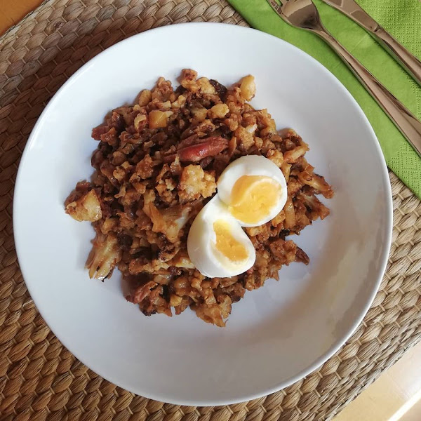 2. Ahora añadiremos la coliflor cruda y que habremos picado con la ayuda de un robot (yo lo hice con la Thermomix unos segundos a Vel.4) y mezclaremos todo bien.