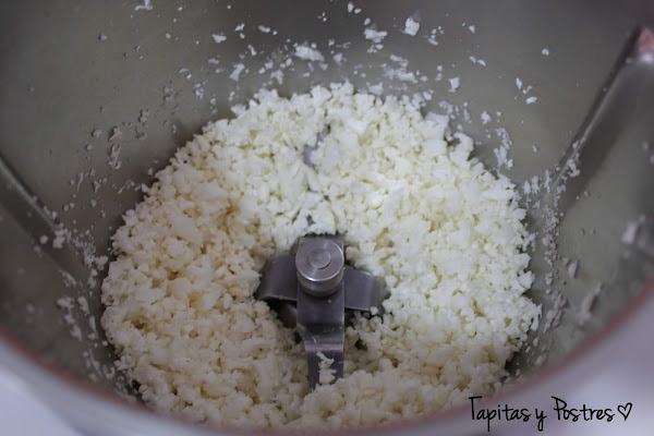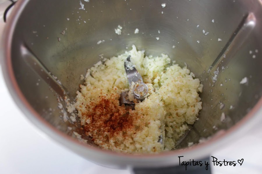 Lavamos la coliflor y la cortamos de manera que solo estén los arbolitos. Descartamos los troncos. Los ponemos en el vaso de la thermomix y picamos 1 segundo a velocidad 5. También podemos hacerlo con un rallador, hasta que nos queden como "migas".