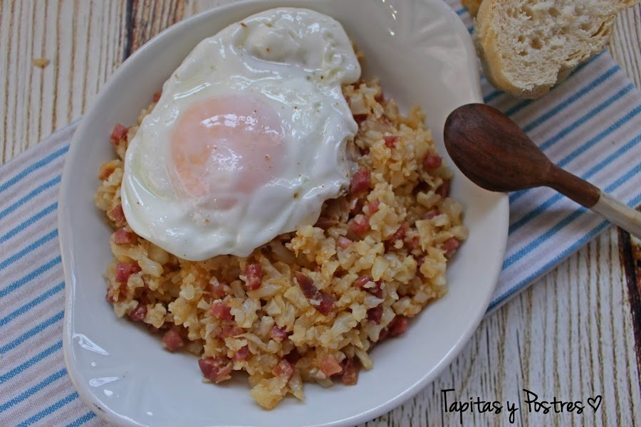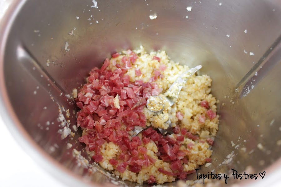 Y al final el jamón. Podemos poner bacon o chorizo en taquitos si os gusta mas.