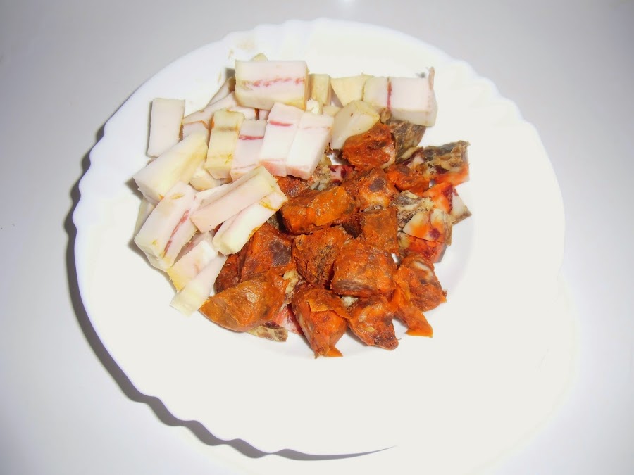 SalComenzamos cortando el tocino y el chorizo en trozos pequeños