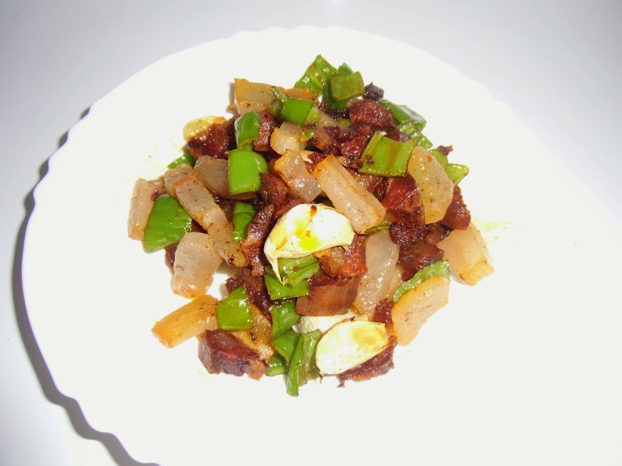 Pasados un par de minutos añadimos el chorizo y el tocino