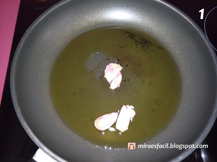 Ponemos el aceite en la satén, con los ajos (dándole un corte a la cascara).