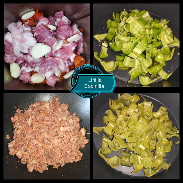 7. Añada 80 gramos de aceite, la panceta, la salchicha fresca y los ajos. Sitúe el recipiente varoma en su posición con los pimientos espolvoreados con sal y regados con los 20 gramos de aceite de oliva. Programe 20 min/120ºC/giro inverso/vel 1. Retire el varoma y mantenga tapado. Vierta el contenido del vaso en el cestillo con un bol debajo para recoger el aceite.