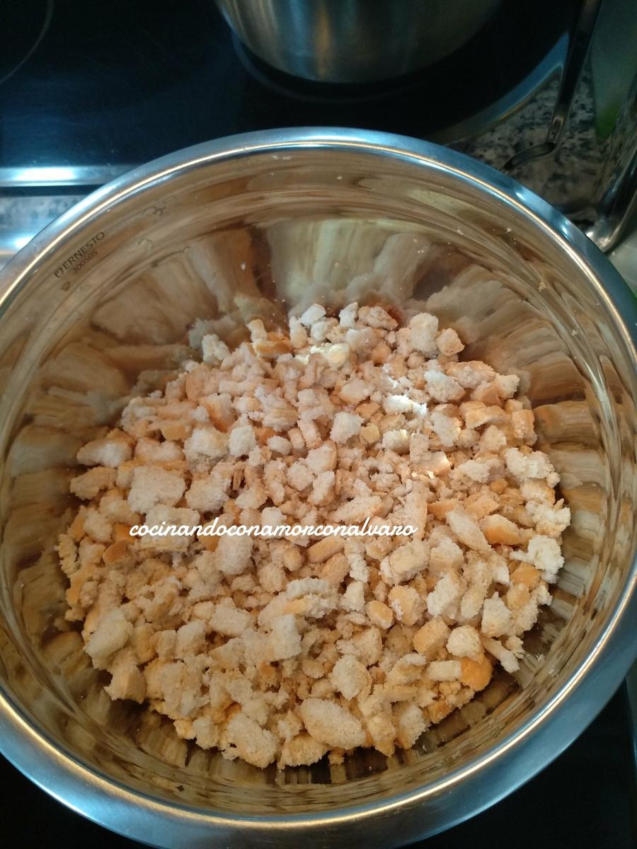 En una jarra añadimos agua y echamos una pizca de sal. Removemos bien y vamos pulverizando las migas, no tienen que estar muy mojadas, solo como si una ducha fuera.