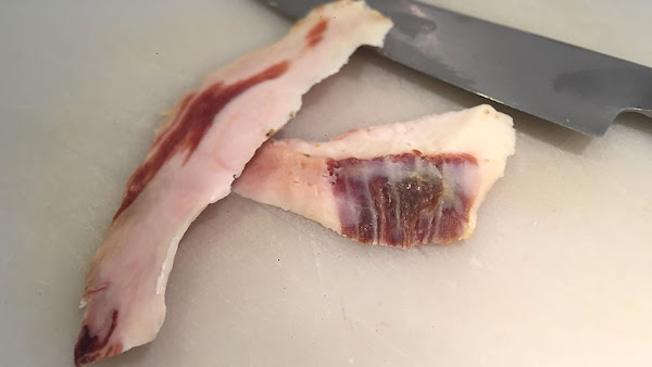 Pica el tocino y el chorizo sin piel en trozos pequeños.