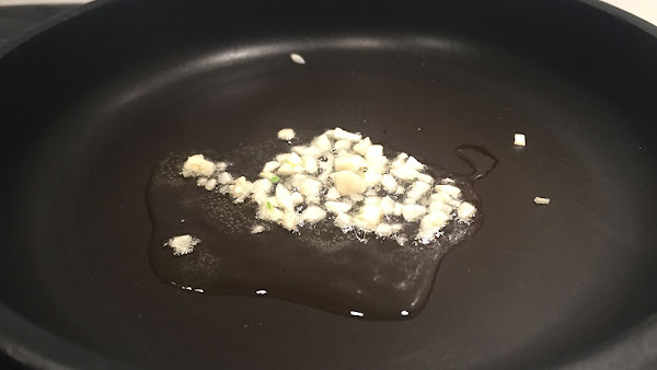 Sartén a fuego alto (8/10) pon a sofreír un par de ajos picados.