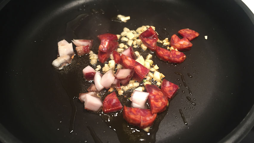Sofríe el ajo picado, el tocino y el chorizo con cuidado de que no se pasen.